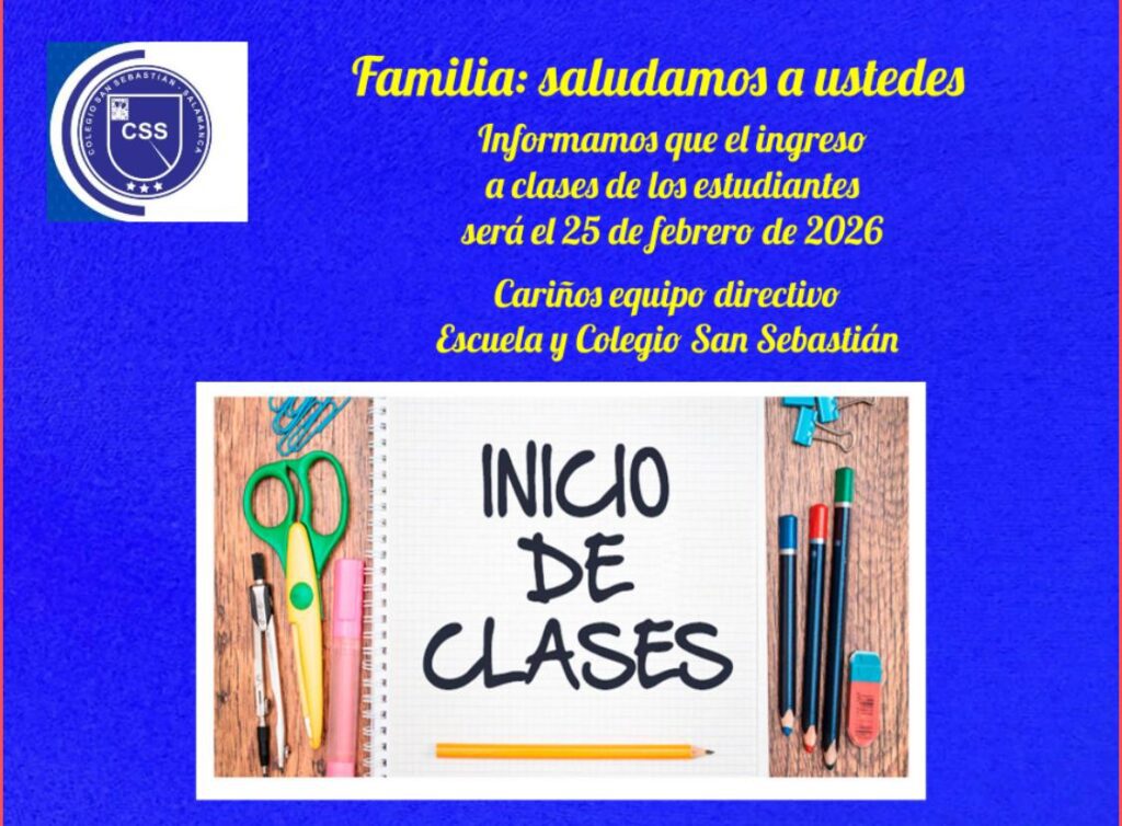 El Colegio San Sebastián informa a su comunidad educativa que el inicio de clases para el año escolar 2026 será el día 25 de febrero, marcando el comienzo de un nuevo período académico lleno de desafíos, aprendizajes y oportunidades de crecimiento para nuestros estudiantes.