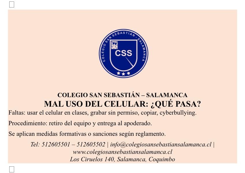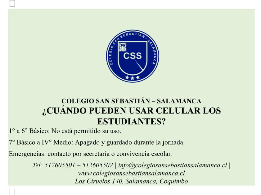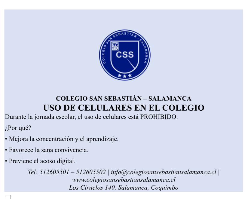 Junto con dar la bienvenida a este nuevo año, recordamos a las familias y estudiantes la normativa vigente respecto al uso de teléfonos celulares dentro del establecimiento, medida que busca resguardar el ambiente pedagógico y fortalecer la sana convivencia escolar.